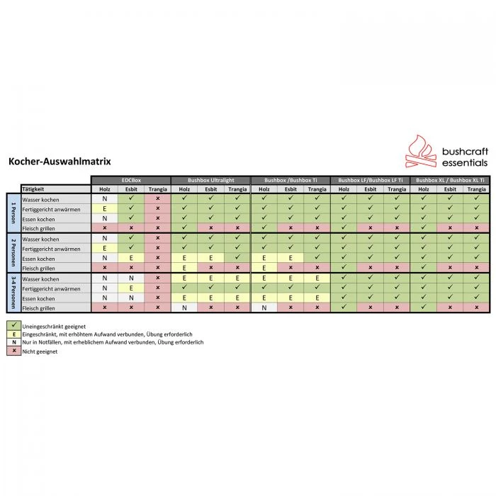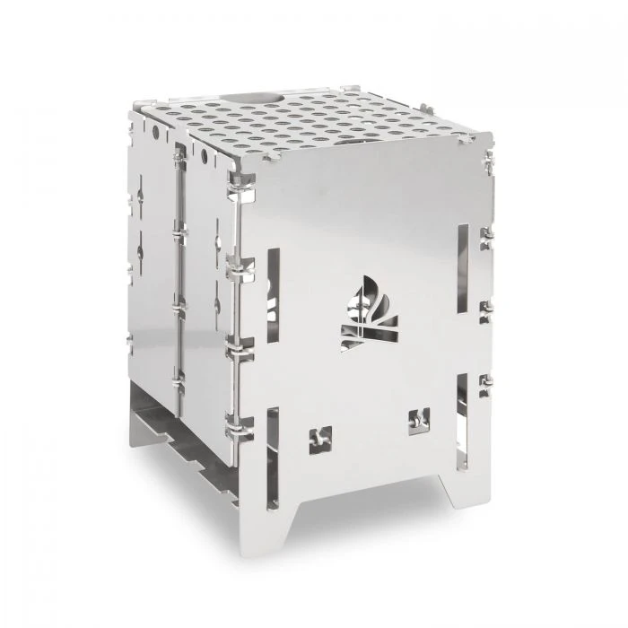 Die Bushbox LF ist ein kleiner, faltbarer Kocher, welcher aus rostfreiem Stahl und zu 100% in Deutschland hergestellt wird. Der Kocher wird mit einer aufwändigen Scharniertechnik gefertigt, welche die Scharniere nicht verkleben lässt. Er kann mit Holz, Esbit oder Trangia betrieben werden und kann Wasser kochen, Fertiggerichte erwärmen und sogar Fleisch grillen. Im praktischen Bushbox LF Set sind neben dem Kocher außerdem Topfauflagen und ein Universalrost enthalten. Dieser kann als Grill, Trangia-Plattform oder als Einlage für Holzkohle verwendet werden. Außerdem ist eine robuste Outdoor-Tasche im Lieferumfang enthalten, in welcher der Kocher im zusammengeklappten Zustand platzsparend transportiert werden kann.