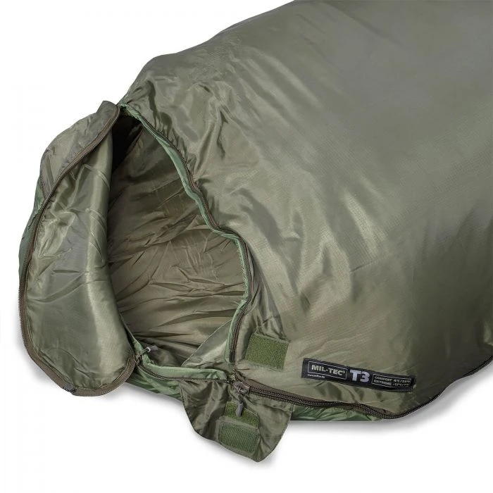 Der Schlafsack Tactical 3 von Mil-tec ist ein Mumienschlafsack mit hervorragender Wärmeleistung bei gleichzeitig geringem Gewicht. Der Schlafsack lässt sich bemerkenswert gut komprimieren, was das Packmaß sowie den Transport positiv beeinflusst. Besonders ist hier auch die Konstruktion des Kopfbereiches. Dieser kann komplett geschlossen werden. Die teflonbeschichtete Unterseite des Tactical 3 verhindert ein Durchnässen.