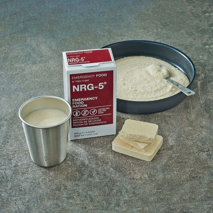 Die Emergency Food NRG-5 Notverpflegung ist laktosefrei und vegan. Eine Packung deckt den Tagesenergiebedarf eines Erwachsenen. Sie ist mit lebenswichtigen Vitaminen und Mineralstoffen angereichert und in neun einzeln verpackte Riegel aufgeteilt. Zerkleinert man die komprimierten Riegel und fügt Wasser hinzu, so kann ein nahrhafter Brei oder je nach Zugabe der Wassermenge ein Energy Drink zubereitet werden. Diese Notfallnahrung ist auch für Kinder ab dem 6. Monat geeignet. Die Riegel können auch pur, gut zerkaut, gegessen werden.
