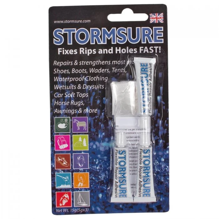 Der Reparaturkleber im 3er-Set von Stormsure ist der ultimative Klebstoff, um Neoprenanzüge, Watstiefel und diverse weitere Ausrüstungsgegenstände schnell und unkompliziert zu reparieren.